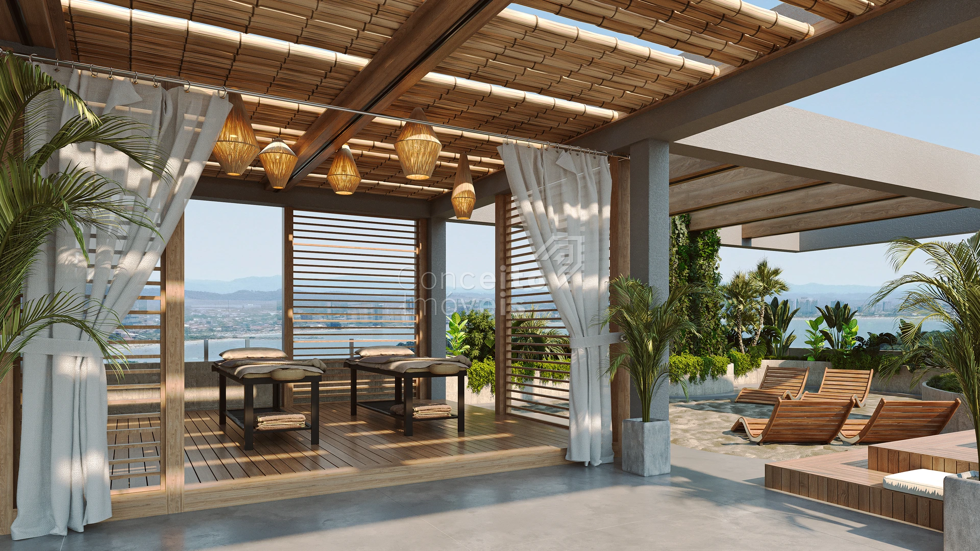 Varanda que reforça a relação entre moradia e estilo de vida litorâneo.