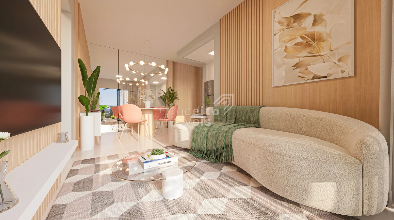 Ao entrar na unidade, o morador é recebido por um espaço social contínuo, onde sala de estar, jantar e cozinha se articulam sem rupturas, ampliando a percepção de área útil.