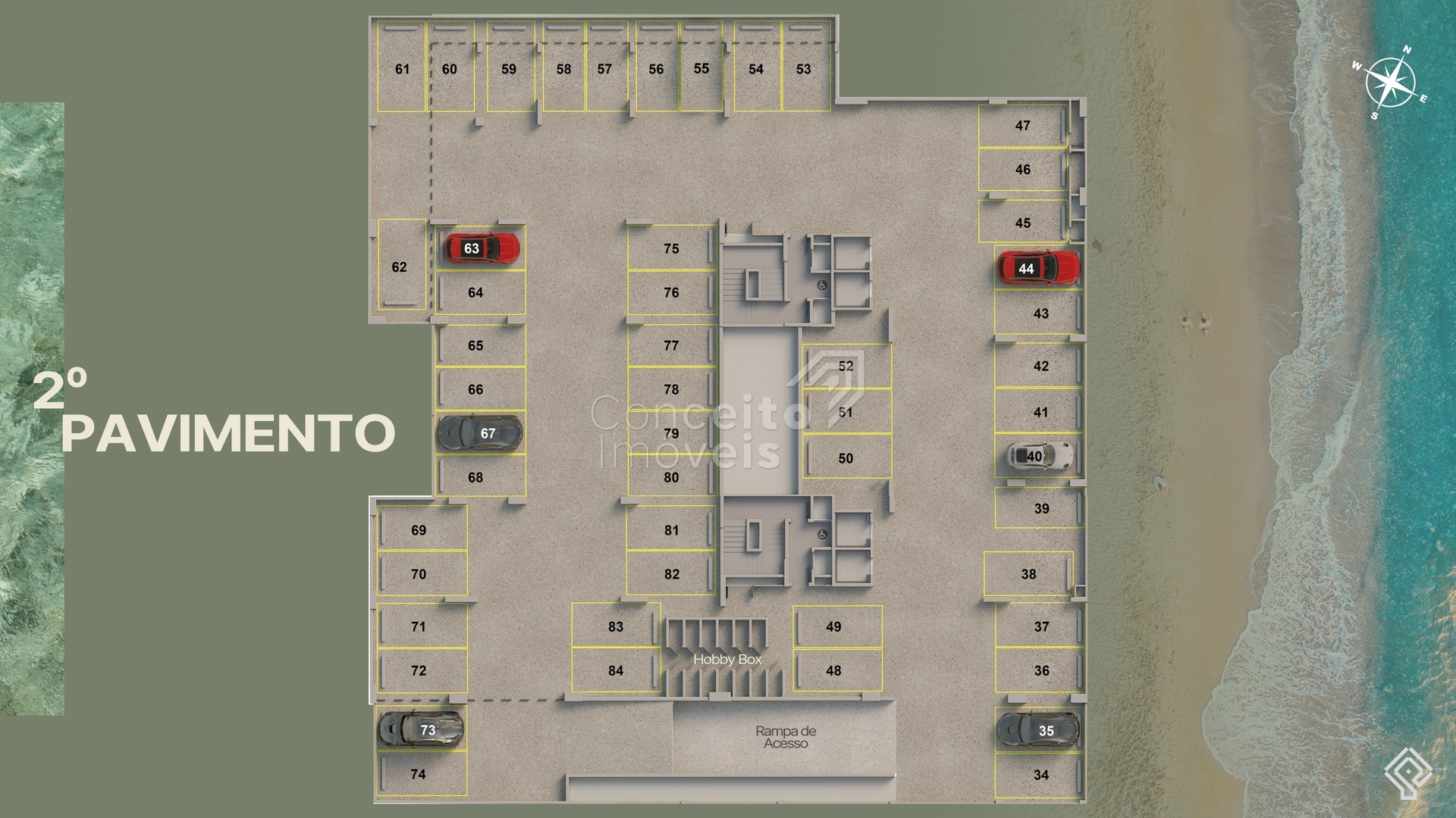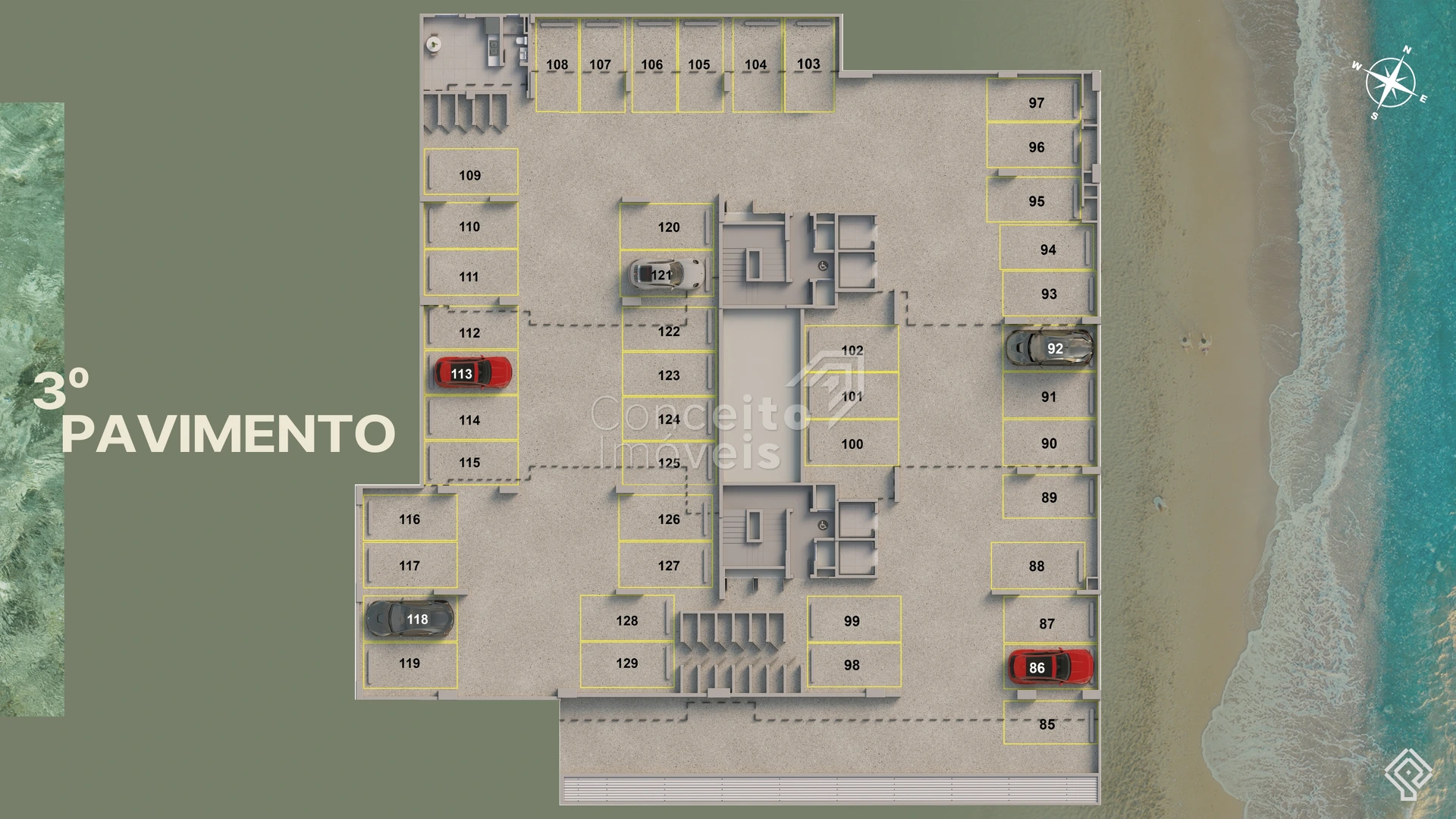 Vagas cobertas, entrada para banhistas / box de praia / preparação para veículos elétricos (em alguns anúncios) — aspecto moderno e adaptado a tendências.