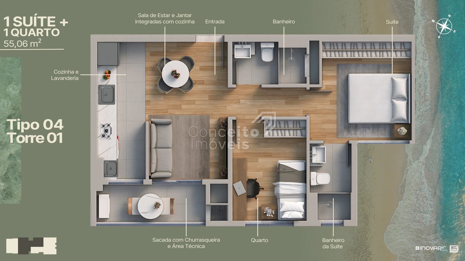 Sacada com churrasqueira, layout funcional, suíte, proximidade da praia