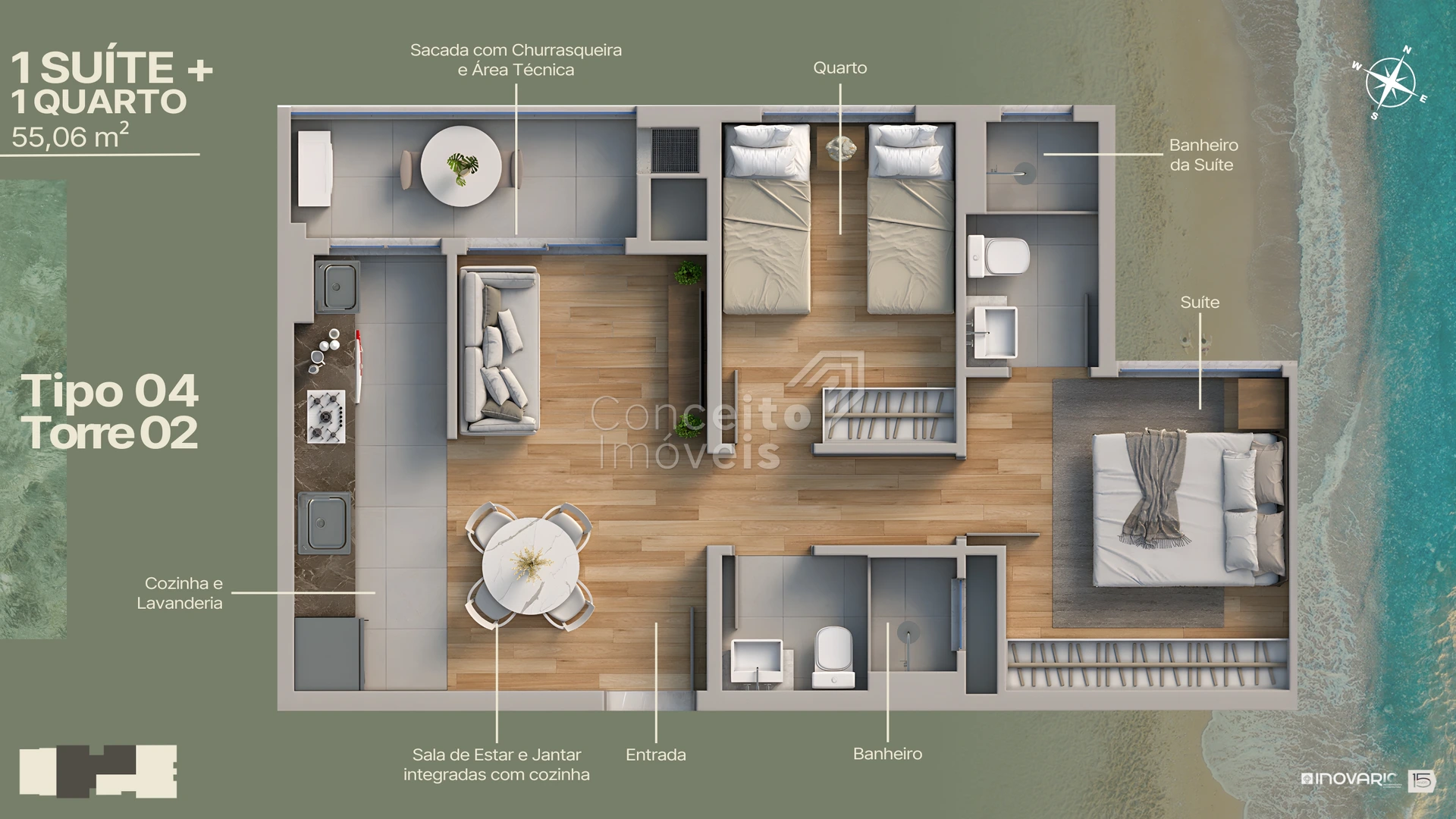 2 dormitórios (1 suíte) ~ 54–55 m² Suíte + 1 quarto, sacada com churrasqueira, 1 vaga de garagem, living + cozinha integrados, banheiro social.