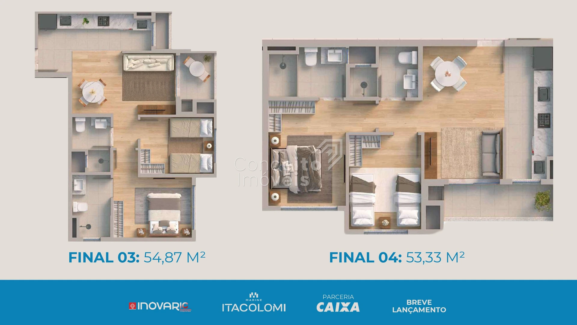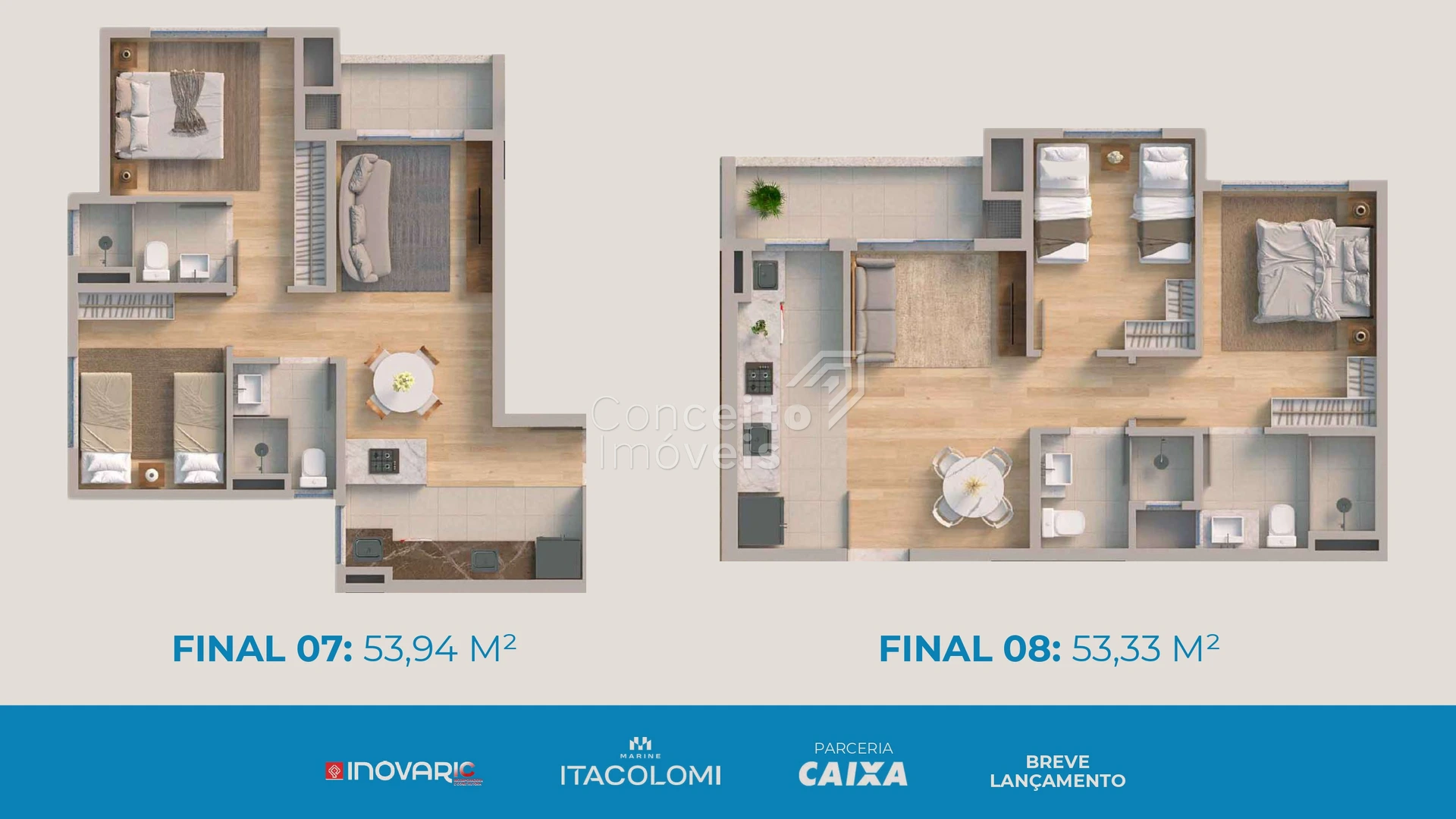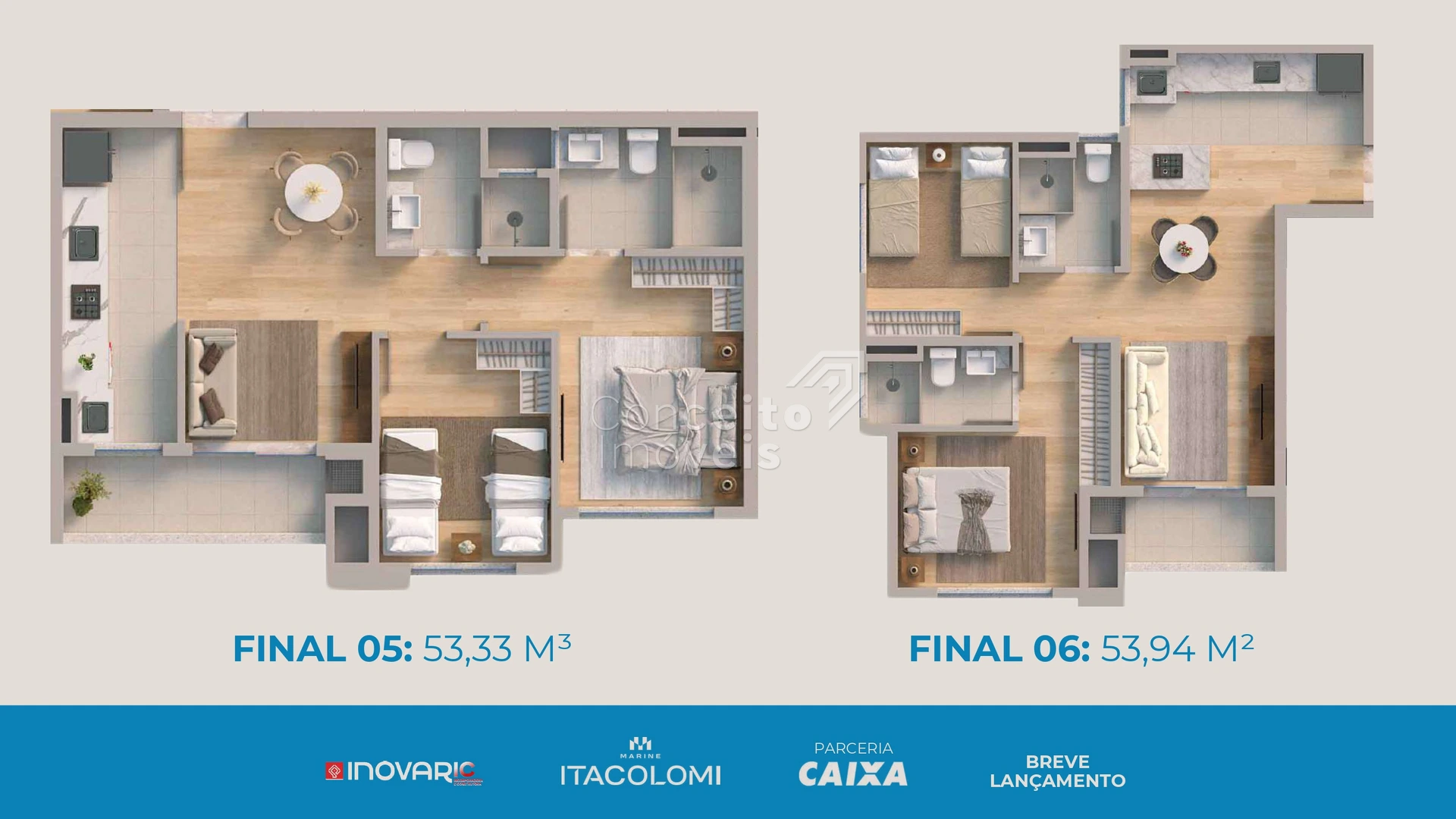 Unidades residenciais com 2 dormitórios, suíte opcional e planta inteligente que privilegia iluminação natural e ventilação cruzada.