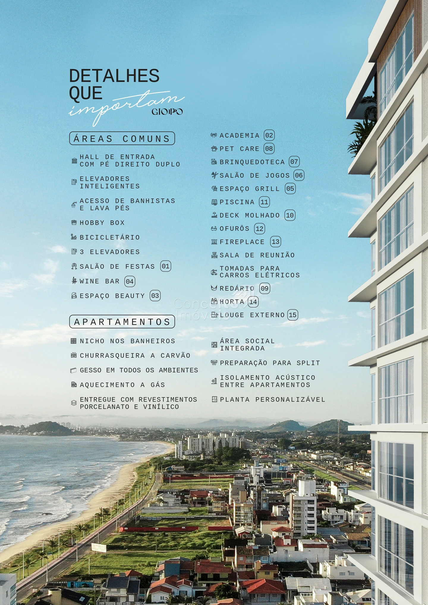“Gioppo Residenza — exclusividade, elegância e mar nos seus dias. Apartamentos amplos de 3 e 4 dormitórios, varanda gourmet, segurança avançada, lazer tipo resort e arquitetura de alto padrão em Barra Velha.”