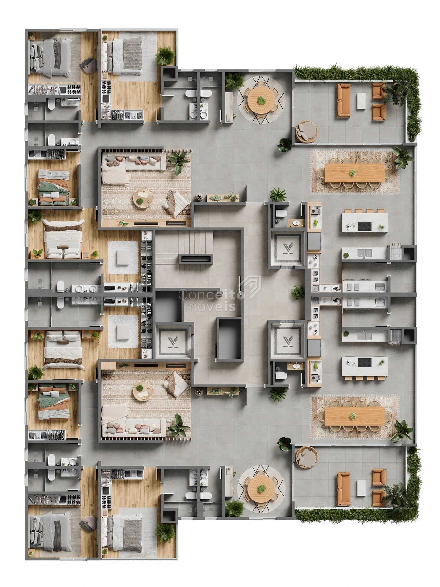 Circulações amplas, silenciosas e com acabamento nobre completam a experiência.