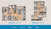 Unidades residenciais com 2 dormitórios, suíte opcional e planta inteligente que privilegia iluminação natural e ventilação cruzada.