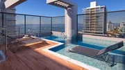 Rooftop com piscina e vista mar, ideal para relaxar ou reunir amigos e família com o mar ao fundo.